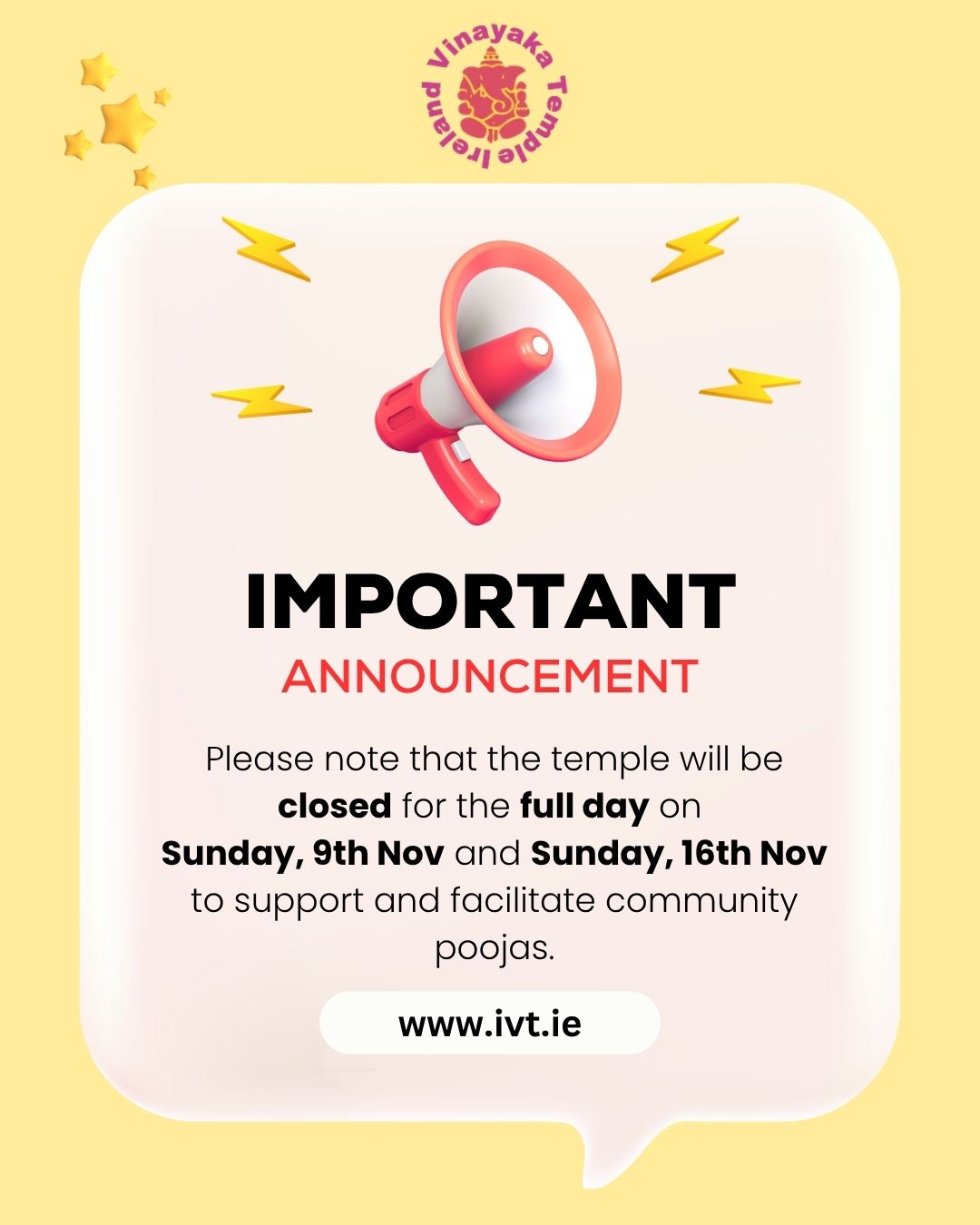 If you are willing to volunteer to service Lord Vinayaka, kindly email your interest to feedback@ivt.ie.