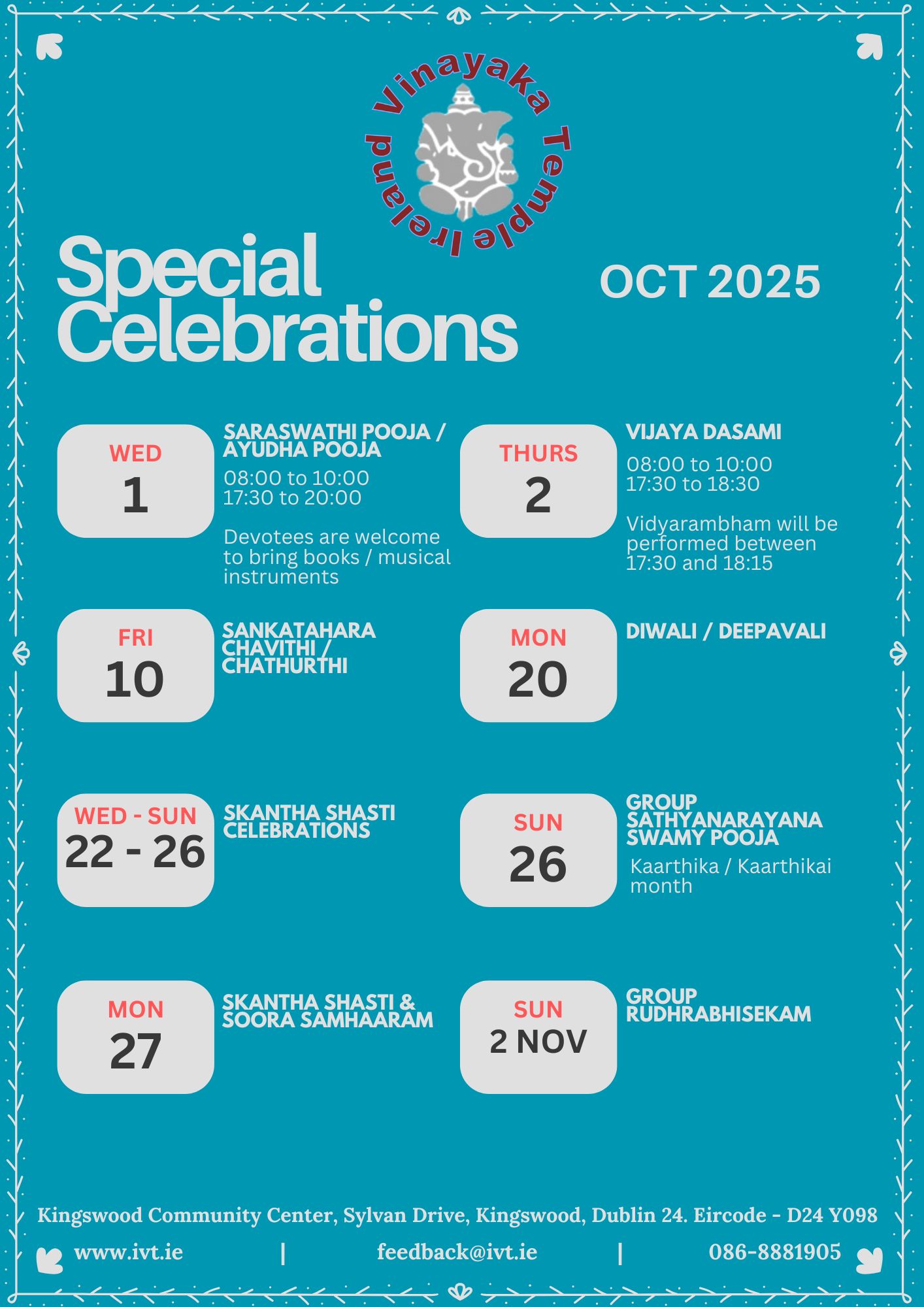 Satyanarayana Swamy Pooja will start sharp at 9:30 am. The devotees who wish to participate are requested to confirm your registration of your interest by sending an email to feedback@ivt.ie before the evening of Friday, 24th Oct.
